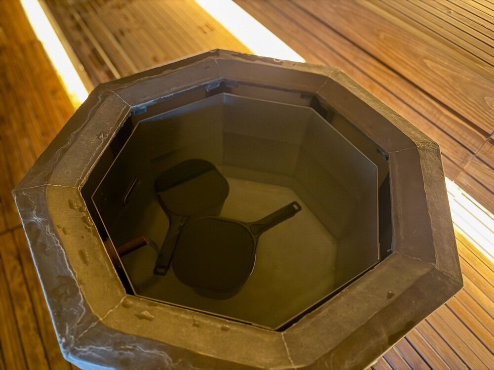 深部まで温まったら、中央に設置された冷水を頭から浴びる新感覚の体験も。身体は熱いのに、頭は冷たい…そんな不思議な感覚を味わえます。