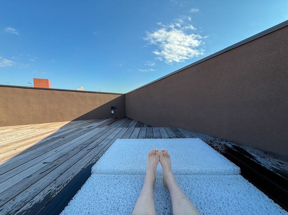はせがわさん:御成桑拿に来たら、ぜひルーフトップで外気浴をおすすめしたいです。鎌倉にいることを一瞬で忘れてしまう解放感が味わえますし、ウッドデッキは水着のまま寝転びOK!大の字になって休憩できる施設はなかなかないので、貴重ですね。
