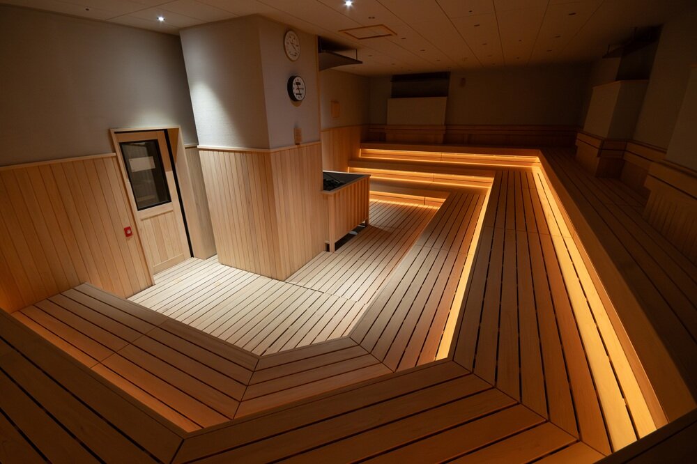 施設の顔ともいえるサウナ室は、2種類の水蒸気と独自の吸気システムを採用した、しっかり温まるのに息苦しさを感じさせないサウナ。